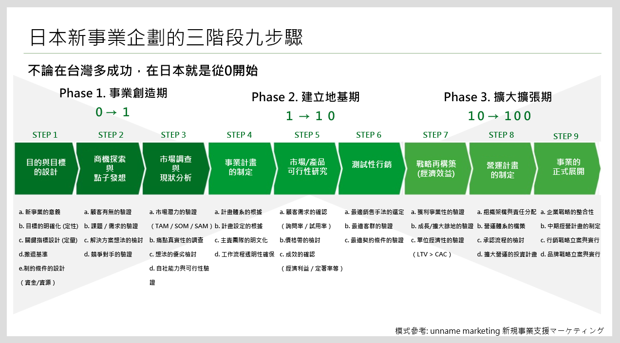 冰山的上層,是我們看得見的市場規模、消費潛力與穩定制度;而在水面之下,則是更深層的文化與信任結構。若要在這裡展開新事業,首先必須從「存在的證明」開始,一步步累積信任,最終才能走到真正的規模化。這也正是我常用來形容日本市場成長歷程的框架——三階段九步驟。