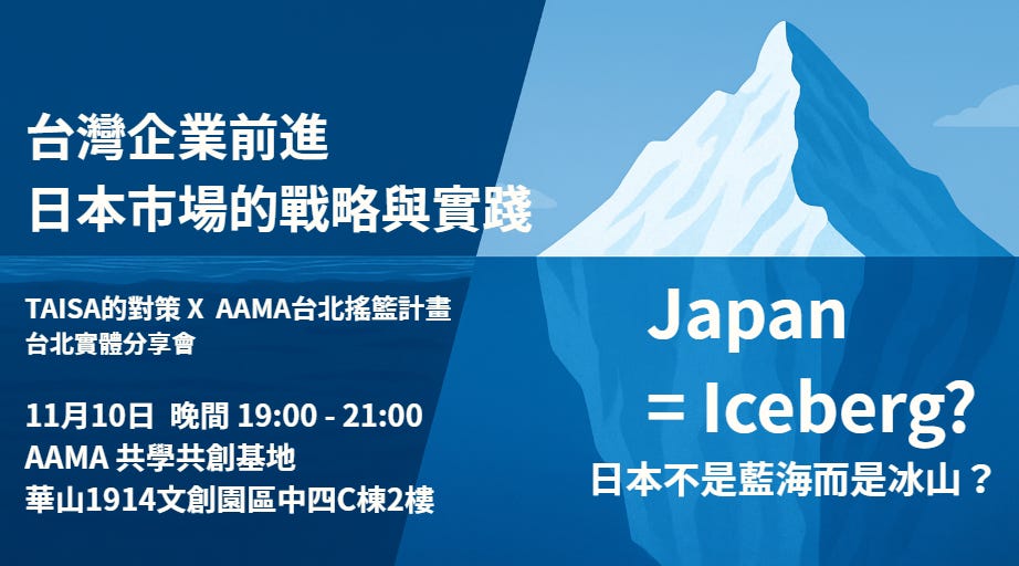 這場活動也會作為 11 月幾場大型活動前的暖身, 讓我們能更深入討論「如何讓台灣新創被日本市場相信」。終於有機會能在台北與大家面對面交流,真的非常期待!名額有限,歡迎有興趣的朋友踴躍報名