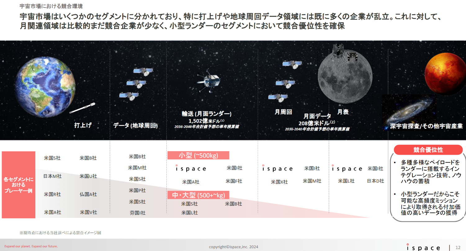 其中像是火箭與地球觀測等,競爭已非常激烈;但在月球領域,特別是「小型月面著陸器(500kg 以下)」這個區塊,競爭企業仍相對稀少,是未來的藍海市場。