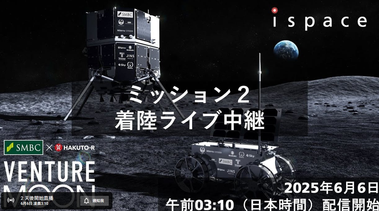 這次 ispace 的 Mission 2 不只是商業任務,更是全球矚目的歷史性挑戰!登月預定時間為 2025 年 6 月 6 日,也就是這週五台灣凌晨時間 3:24 AM
