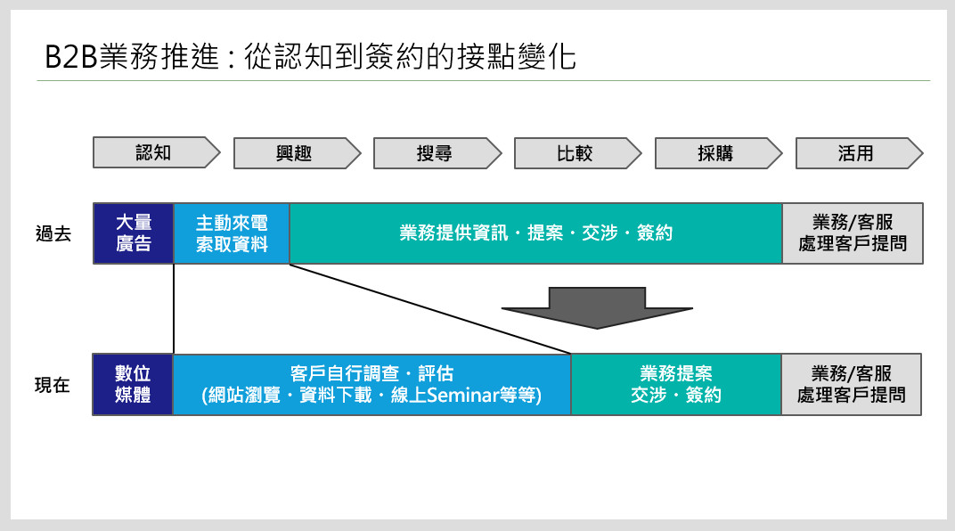 因此,我們的任務也跟著改變了。在這個時代,業務團隊的角色不只是「接觸」與「跟進」,而是要成為潛在客戶資訊探索過程的陪跑者。當他們在研究、評估、比較的每個階段,都能不斷看到我們提供的內容、洞見與實例,才有可能在做出商業決策時,自然地把我們放進選項裡。