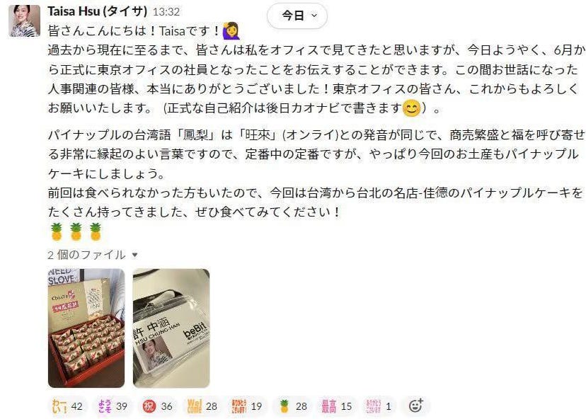 附上在前公司日本入社的時候,第一次發的貼文。我的習慣是會在名字旁邊加上片假名(タイサ) 讓大家知道我的名字怎麼唸,不然我們的英文或中文發音會讓日本同事搞不清楚