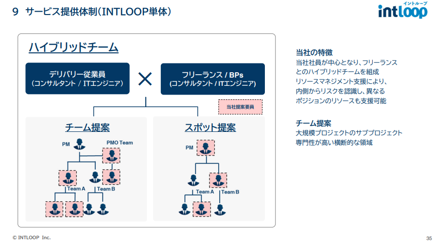 更特別的是,它並不是把平台與顧問業務割裂開來,而是以「Hybrid Team(混合型團隊)」的方式來運作。公司的正社員顧問與平台上的自由職業人才會共同組隊,既能提供完整的大型專案團隊,也能靈活地進行單點支援。這種結合了顧問公司的專業度與平台企業的靈活性的模式,成為INTLOOP在市場上最大的差異化優勢。