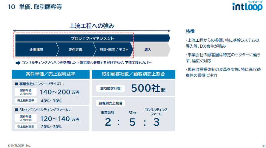 從數據上來看,事業公司直接委託的案件單價往往高達每人月 140~200 萬日圓,毛利率可達 40~70%;而來自 SIer 或顧問公司的案件,單價也有 120~140 萬日圓。這樣的結構,讓 INTLOOP 不僅能維持高單價專案的獲取,還能靈活涵蓋不同客戶來源。目前超過 500 家企業委託他們,其中事業公司占比最高(約 2:5:3),顯示出他們已經跳脫傳統顧問只依賴 SIer 的模式,真正建立起與終端客戶的直接關係。