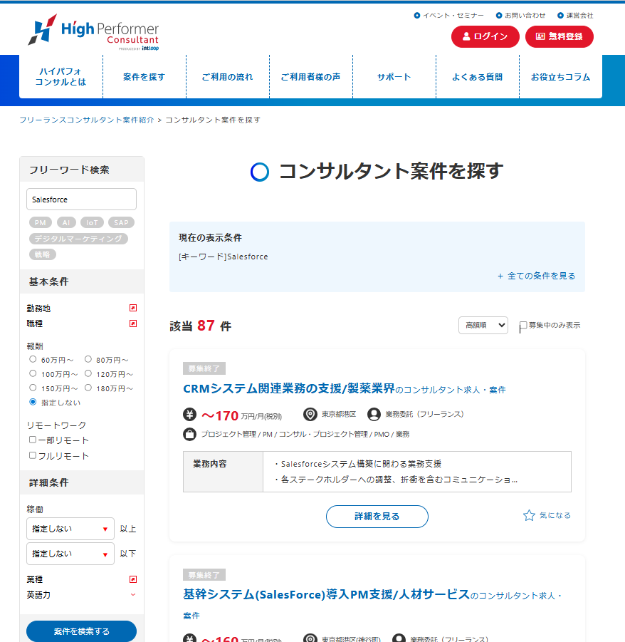 在 INTLOOP 的 High Performer Consultant 平台上,就能看到不少與 Salesforce 導入相關的案件。這些案件從需求定義、PMO 支援,到後續的測試與資料移轉都有,報酬通常落在每月 80~160 萬日圓之間。