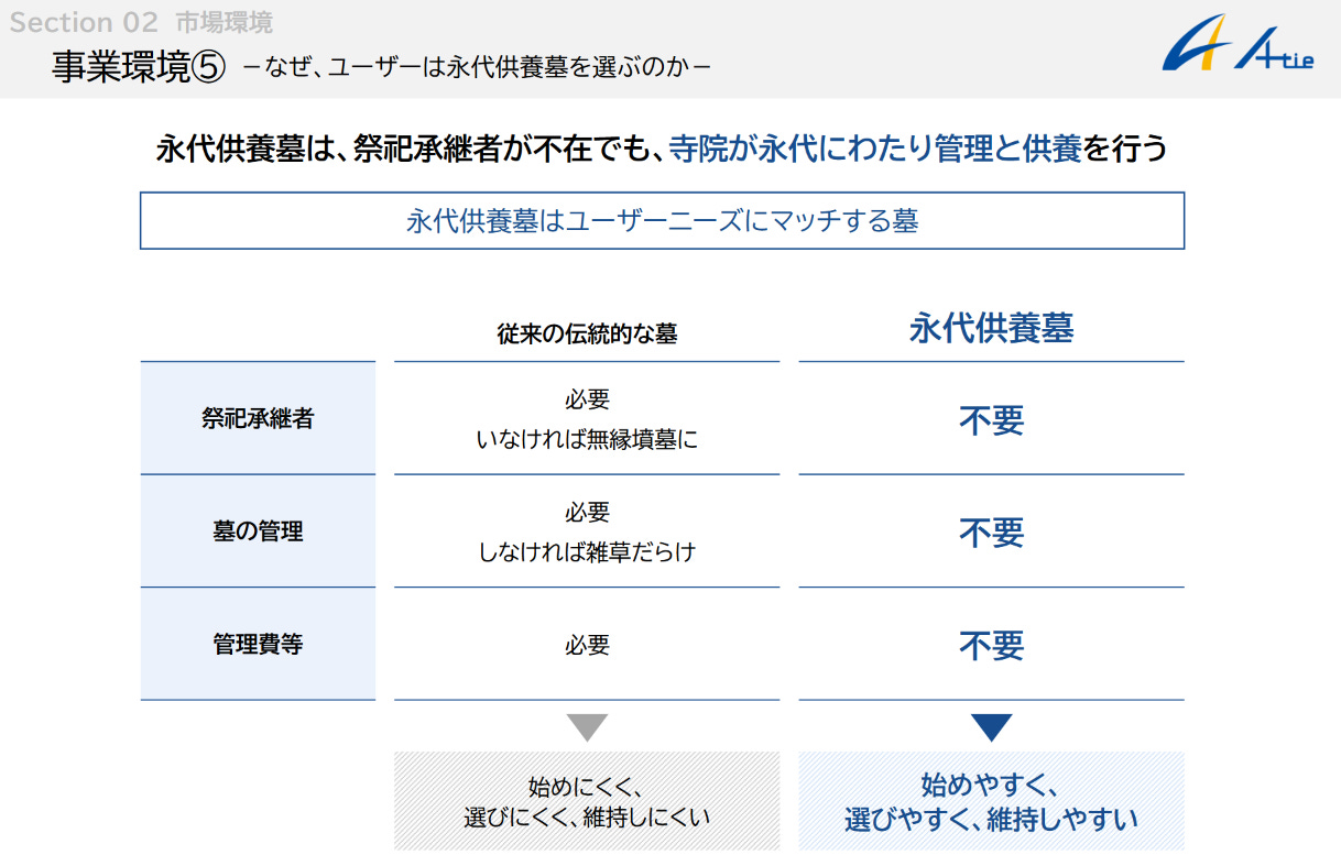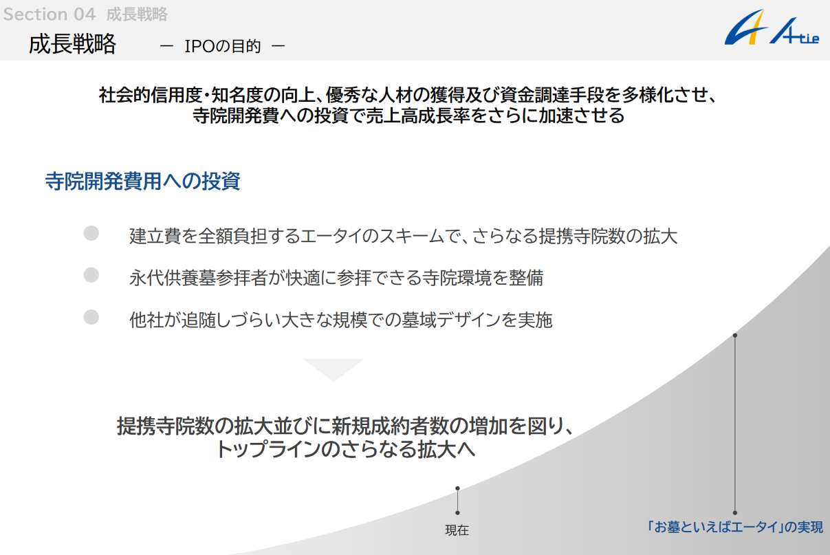 同時,藉由規模化的墓園設計,形成其他公司難以追隨的門檻。最終,Atie希望藉此擴大新成約者的數量,推動營收成長曲線進一步加速,並實現「提到永代供養墓,就會想到Atie」的市場定位。