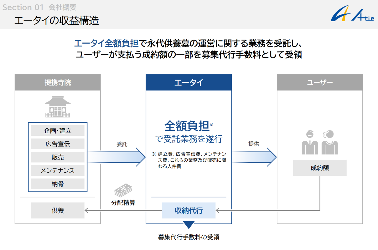 接著,Atie承接墓園的行銷推廣、合約手續、現地接待與後續的維護管理,讓寺廟能專注於宗教活動,而不必承擔高額的初期投資與營運風險。當使用者購買永代供養墓時,所支付的費用會由寺廟與Atie分配,Atie以「募集代行手數料」作為主要收入來源。