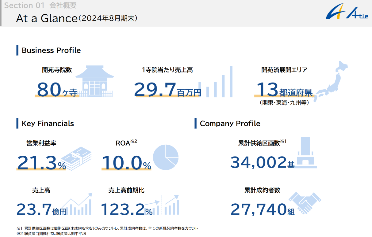 截至2024年8月,Atie的營運規模已展現出強勁的成長力。公司目前已與全國 80座寺廟 建立合作關係,累計提供超過 34,002個墓位,並成功吸引 27,740組使用者 成約。在財務表現方面,2024年度的年營收達到 23.7億日圓,年增率高達 123%,營業利益率更維持在 21.3% 的高水準,這在終活相關產業中屬於領先地位。