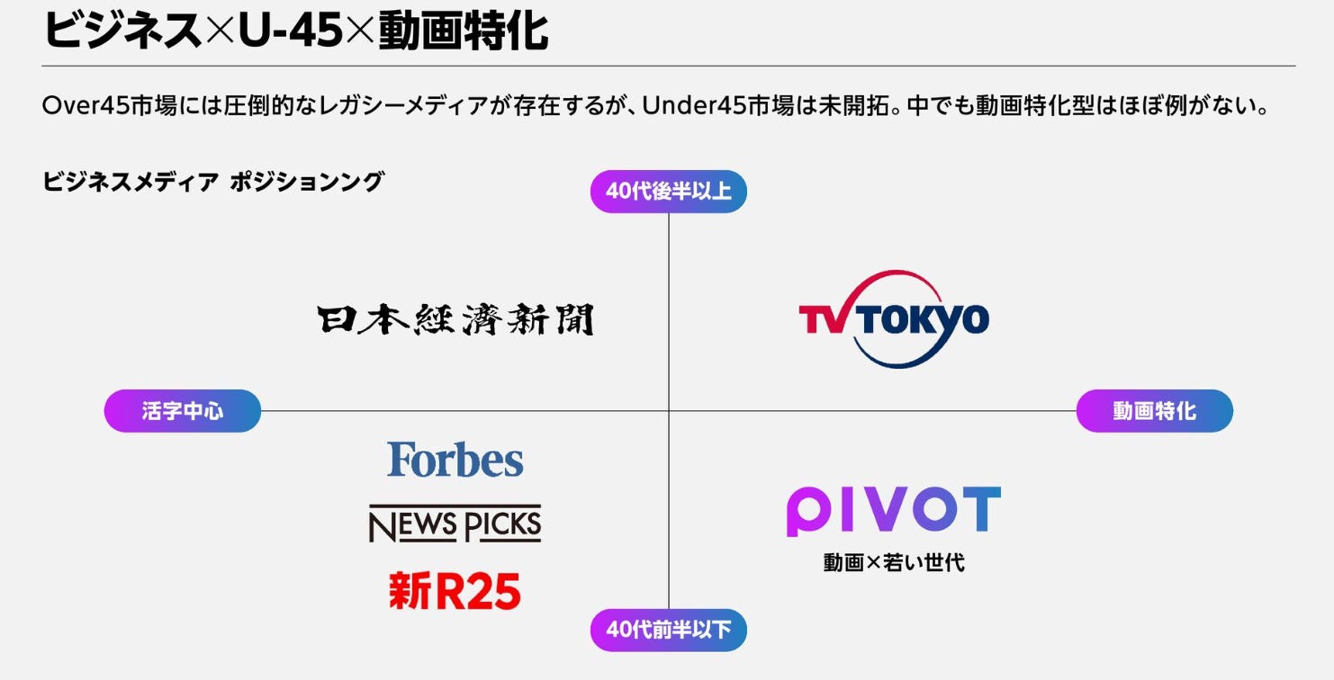 日本的 45 歲以上市場早已被《日本經濟新聞》與 TV Tokyo 這類傳統媒體掌握,但 45 歲以下族群仍是一片待開拓的藍海,尤其缺乏專注於「影像 × 商業知識」的媒體。這正是 PIVOT 的切入點。它與 Forbes、NewsPicks、新 R25 等以文字為主的媒體形成明確區隔。