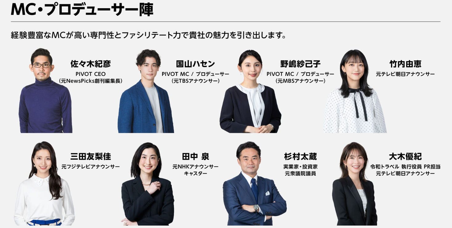 如果社長的經歷代表了戰略方向,那麼 PIVOT 的團隊就是實力後盾。約 50 人的規模中,包含來自 NewsPicks、Huffpost、NHK、TBS 等媒體的製作人,也有出身 電通、CyberAgent、Amazon、SoftBank 的行銷與管理專才。這樣的多元組成,讓內容能兼具專業影像製作與數據驅動行銷。