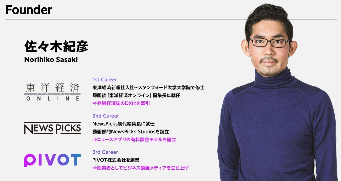 PIVOT 的創辦人兼代表取締役社長 CEO 佐佐木紀彦,是典型「媒體與商業交叉」的專業經營者。他從《週刊東洋経済》記者起步,到史丹佛大學取得國際政治經濟學碩士,再回國主導《東洋経済Online》的數位化轉型。