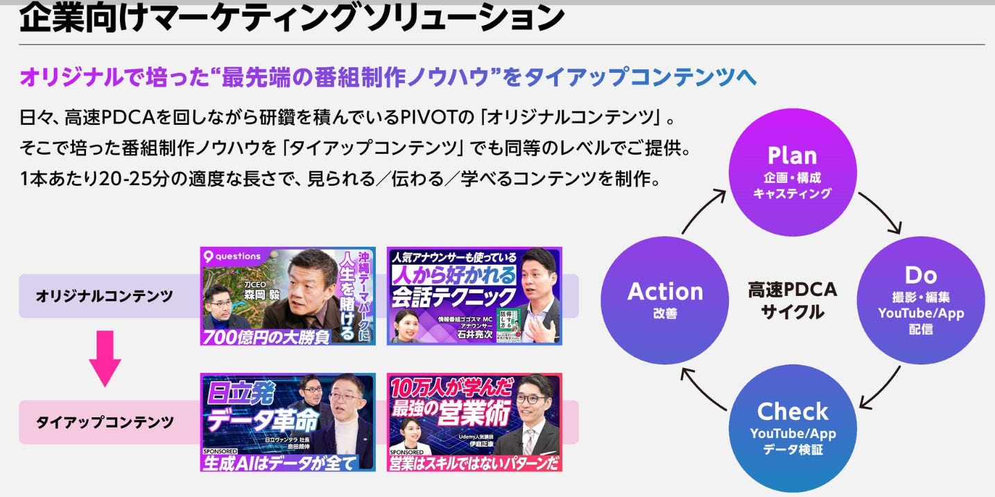 PIVOT 不只做內容,更將影像製作的專業延伸為 B2B 行銷解決方案。它把原創節目中的製作 know-how,轉化為 Tie-up 內容,協助企業以專業節目形式講好品牌故事。從 企劃與人物邀請(Plan)、拍攝與編輯(Do)、數據驗證(Check),到 回饋優化(Action),形成完整 PDCA 流程。
