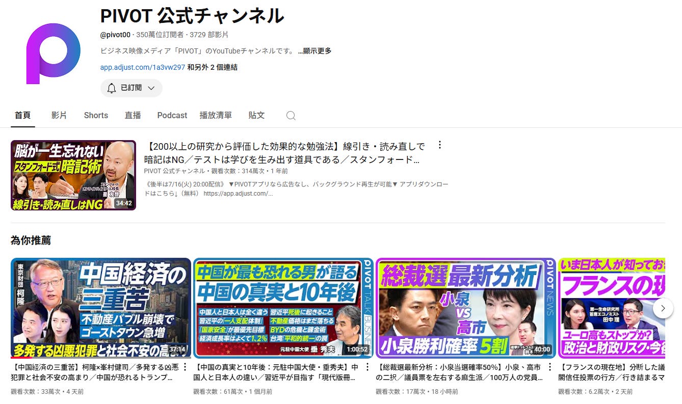日本最受矚目的商業知識型頻道PIVOT,350萬訂閱的成功模式,為台灣內容媒體與教育產業帶來新啟發。