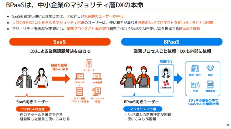 於是 BPaaS 應運而生:不只給系統,連同「會運轉的流程與專業團隊」一起提供,讓工具與執行真正結合。代表案例是近年來改名的 Chatwork 母公司 Kubell,他們已把 BPaaS 定為核心成長戰略。