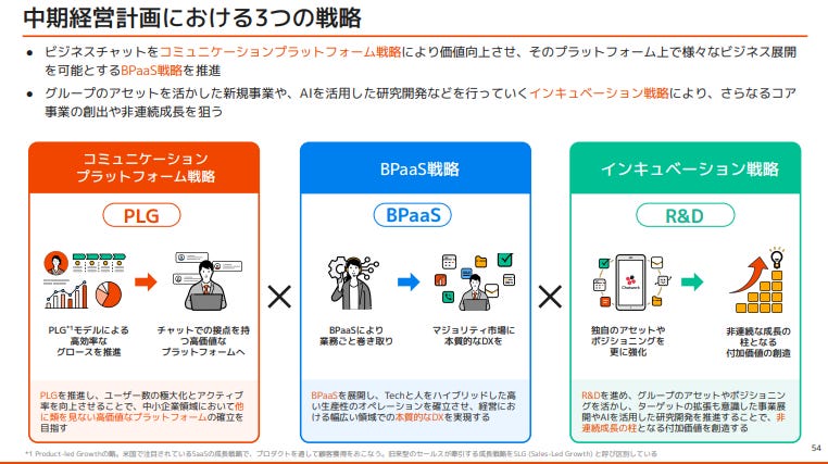 ①在 溝通平台戰略(PLG: Product-Led Growth) 方面,Kubell 將延續 Chatwork 的使用者基盤,強化以產品體驗驅動的自然成長機制。透過持續優化 UX、導入 AI 輔助功能與外部 SaaS 的串接能力,讓 Chatwork 從單純的訊息平台進化為「日常工作基盤」。這一部分的重點,是提升平台本身的價值密度,讓其成為 BPaaS 的自然入口。