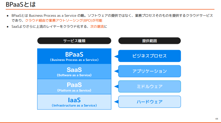 近年日本出現一種新型訂閱服務 BPaaS(Business Process as a Service)。它延伸自 SaaS,從「導入工具」再往前一步到「把流程運轉也外包」,結合雲端技術與專業代行,協助企業在 IT 人才不足的情況下仍能推進 DX。