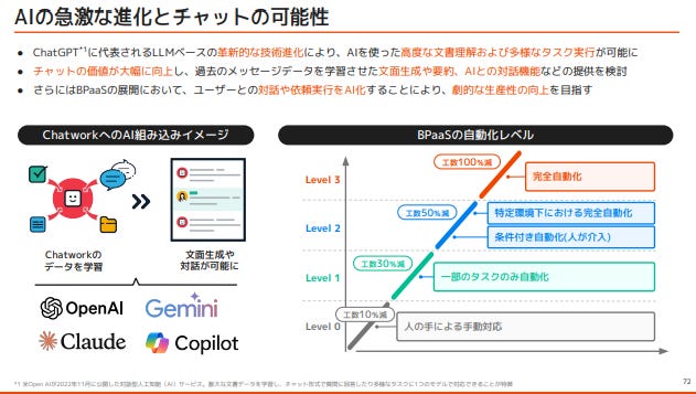 Kubell 的 BPaaS 並非止於「人力代行」,而正邁向 AI 驅動的流程自動化。公司將自動化分為四個層級:從 Level 0 的人工操作,逐步進化至 Level 3 的全自動運行。隨著 OpenAI、Claude、Gemini、Copilot 等大型語言模型導入,Chatwork 平台成為「人與 AI 共同工作的空間」。
