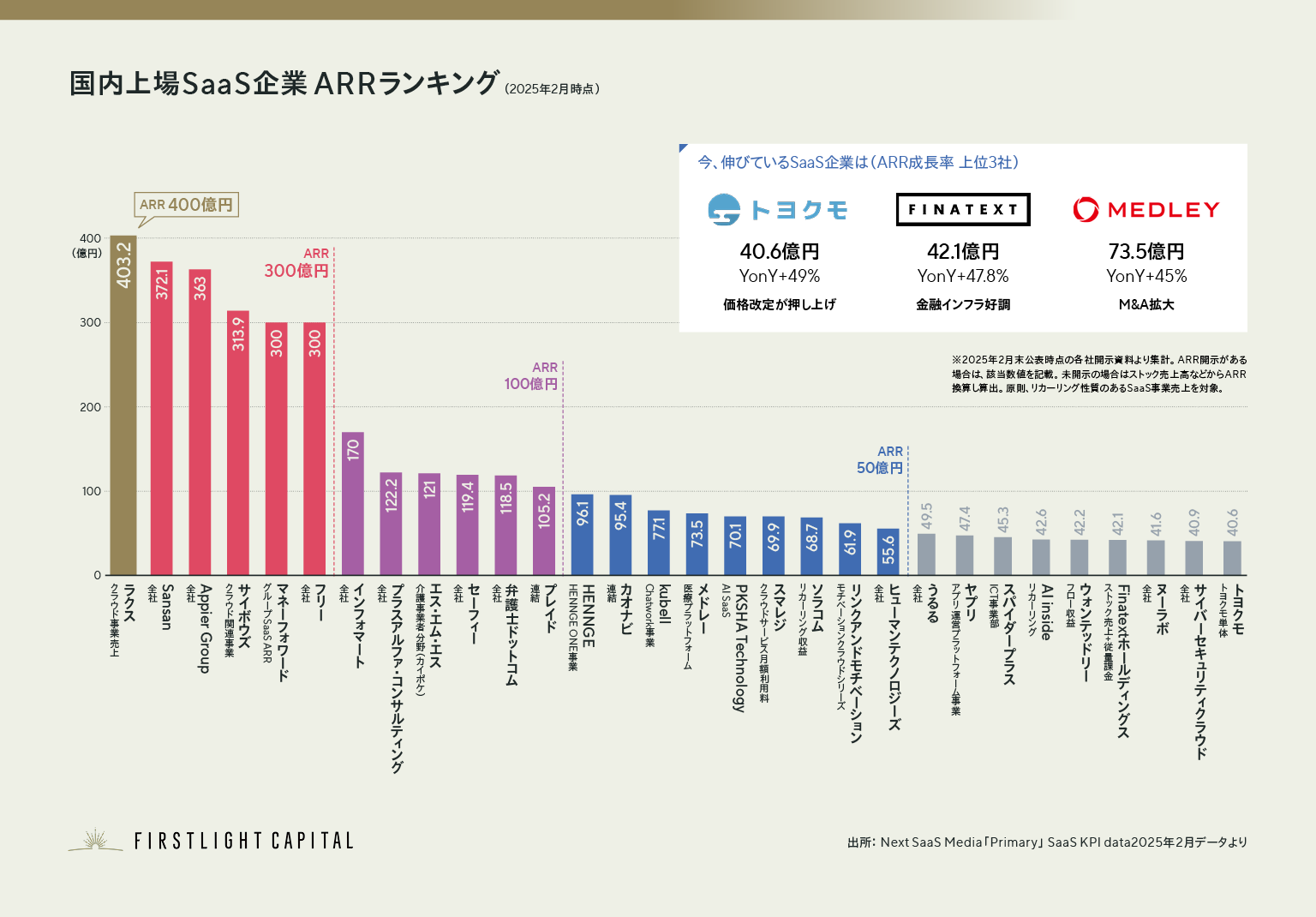 根據 First Light Capital 的統計,2025 年 2 月時,日本上市 SaaS 企業中,已經有 12 家公司 ARR 超過 100 億日圓,其中第一名更是突破 400 億日圓 的大關。這代表 SaaS 在日本資本市場,已逐漸走出小眾產業的範疇,真正成為大型企業的商業模式。