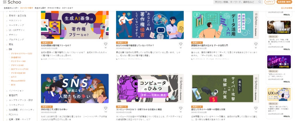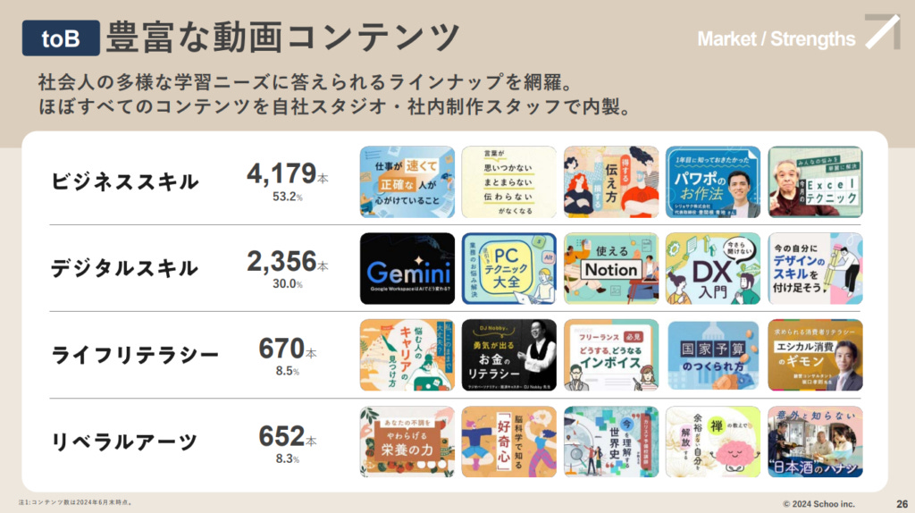 Schoo平台上提供約8000門線上課程,涵蓋四大類別: Business Skill (商業技能)、 Digital Skill (數位化技能)、Life literacy(人生素養)、liberal arts(博雅教育)。其中又以最前面的商業技能學習為大宗,占比是總體課程的53.%,數位化課程則為30%。其中特別注意到: 這些課程的絕大部分都是由Schoo公司自有的攝影棚、自有工作人員編輯內製而生的課程。具體的製課流程與內容並沒有對外公開,但可以看從他們公司對外招聘課程企劃指導的招募需求來看,主要是從商業雜誌、書籍、新聞等製作業界來找到有經驗的人入職擔任。