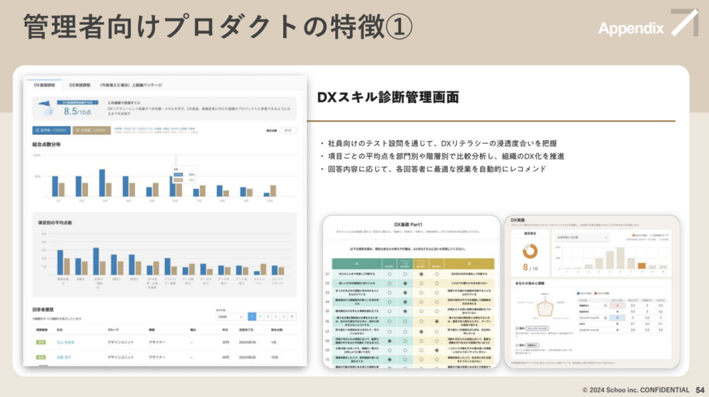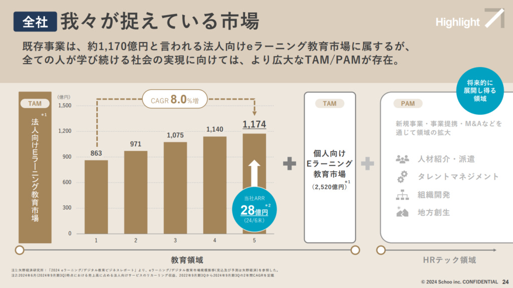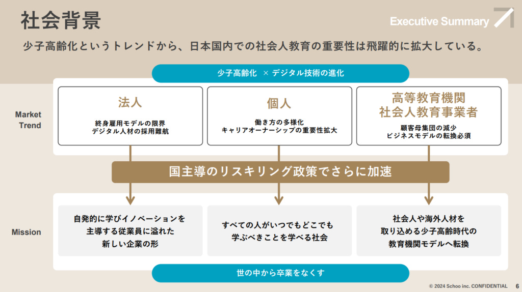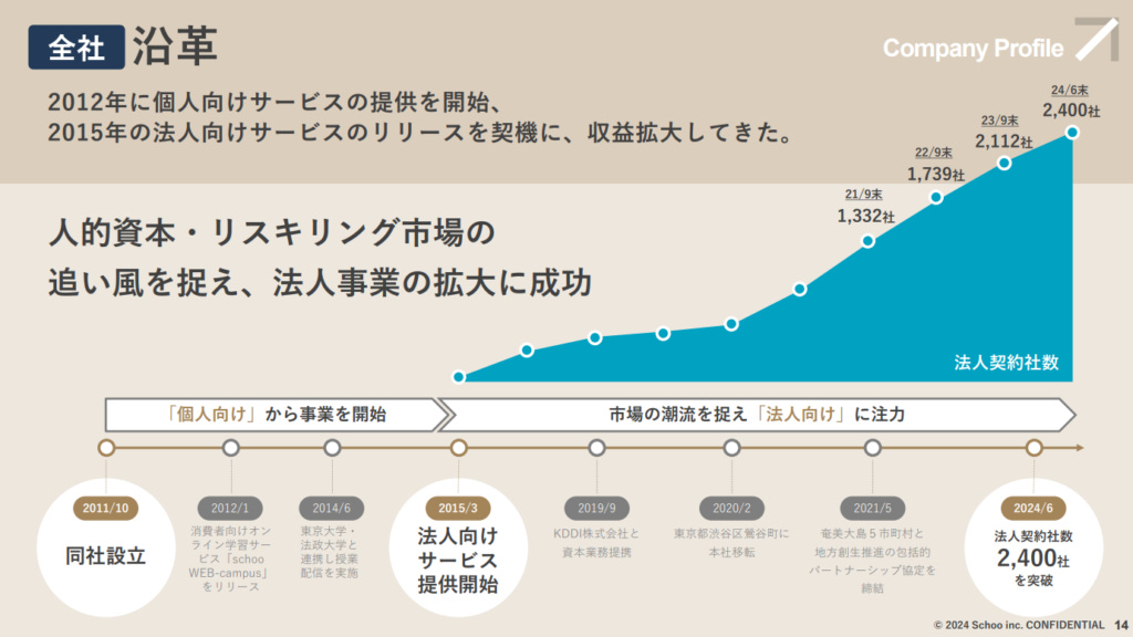 回顧Schoo從創業至上市的發展歷程,2012年創立初期主要面向一般消費者提供學習平台,但自2015年起轉向法人客戶後,事業增長迅速。這一轉型抓住了日本企業對「Reskill(重新技能培訓)」和人力資源培育的需求,並憑藉其法人教育學習平台滿足了企業的內部培訓需求。截至2024年6月上市時,Schoo已與2400間企業簽訂了長期合約。