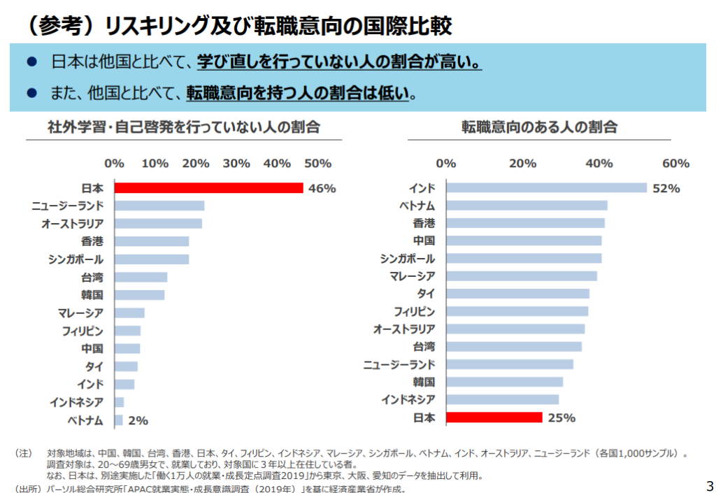 根據2019年報告,日本勞動者在自我投資和轉職意願方面相對保守,遠低於亞洲其他國家和地區。長期以來,日本職場重視穩定性、終身雇用的文化以及對轉職的低接受度,使許多日本勞工更傾向由企業承擔學習成本,少有自費進行學習。因此,日本政府主動推動Reskill政策,並計畫在五年內投入1兆日圓,提升國民的技能和競爭力。此政策涵蓋經濟產業省、厚生勞動省與文部科學省的多項措施,包括補助學費、提供課程及職涯發展支援。