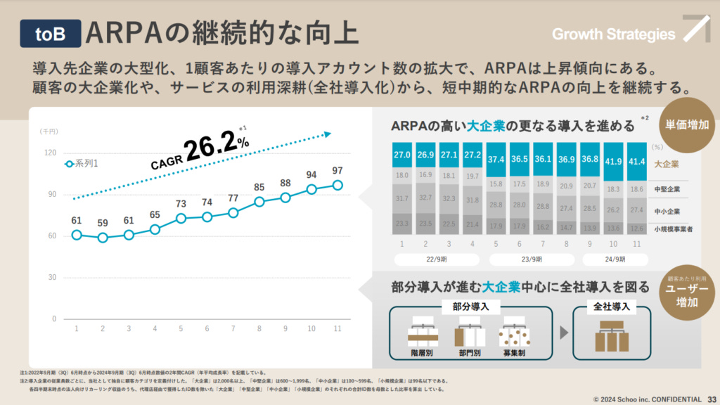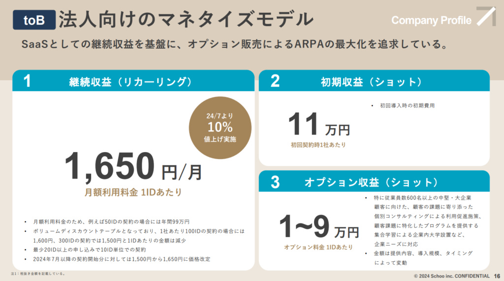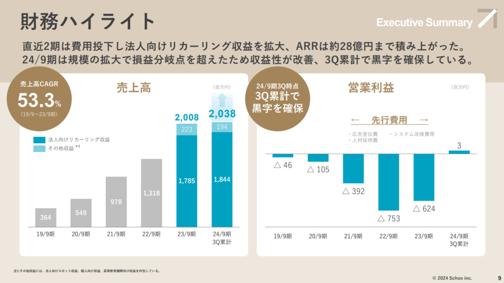 順利上市的Schoo的實際經營成效如何還是要從數據面上來看最清楚,在上市時間點2024財年的Q1-Q3累積營業額達到20.38億日圓,3季的收益就已經超越了去年全年的收益,可預期到本年度年度會有更好的業績表現。並且不同於過去在未上市的新創期間連續5年的虧損,在24年順利轉虧為盈,想必前兩個年度再準備上市期間增加相當大的成本,目前即便是只有小小的3百萬營業額但可以說是苦盡甘來。目前的營業額中又有90%都是法人客戶訂閱的穩定營業額,契約數2400間公司、平均每家公司每月的月費為9.7萬日圓,這部分的收益隨著未來法人客戶的持續累積將會成為重要的定心丸,讓Schoo可以更穩定的經營並做出更好的課程內容。