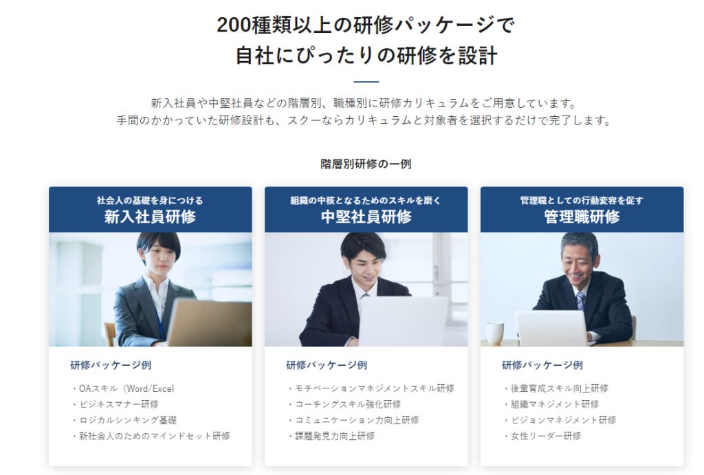 日本新創公司Schoo以提供超過8000門課程迅速崛起,課程涵蓋商業技能、數位技能、人生素養與博雅教育四大領域,尤以商業技能課程占比達53%。Schoo的法人教育平台吸引了2400間企業訂閱,用戶月費每人1650日圓,採靈活的課程組合,針對不同職位設計專屬培訓,讓企業內部的新人、中層與管理層均可受益。