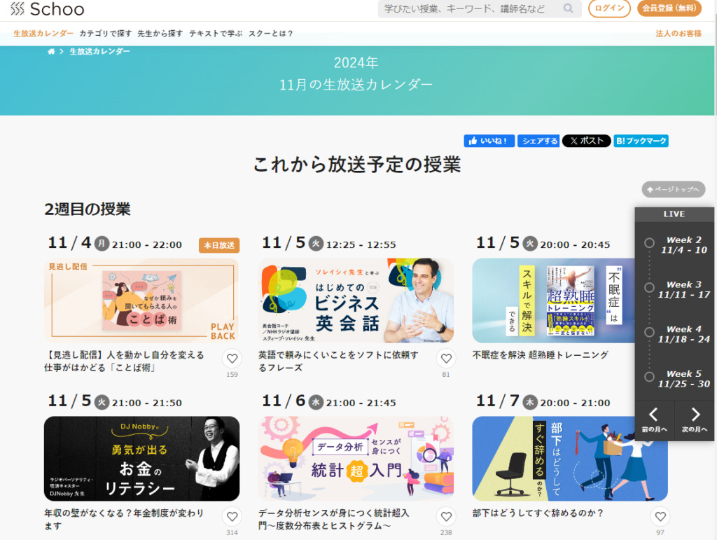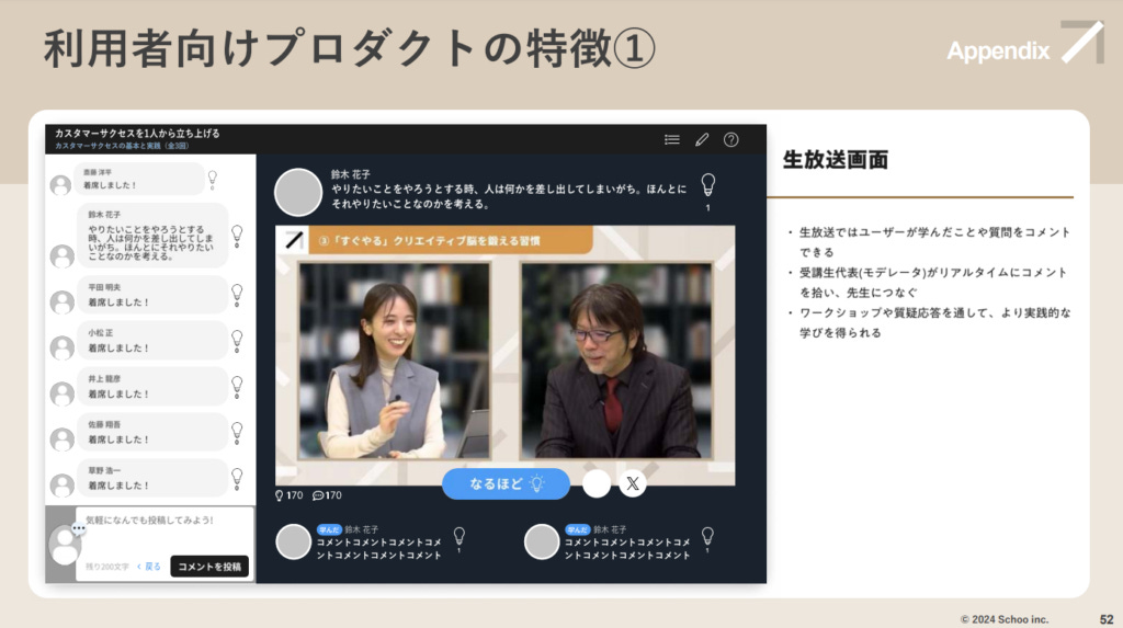 實際上的系統畫面的一大特性是在「共同上課」、「帶入感」的重要性,所以Schoo的上課很多都不是錄播而是以直播方式進行。