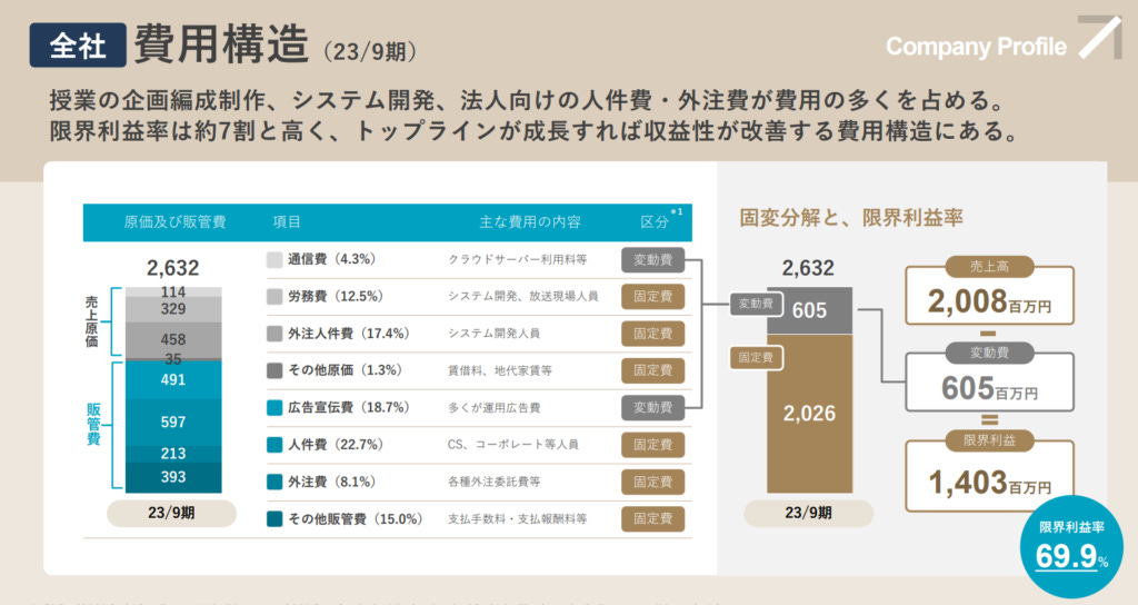 同時,在剛剛上市的財報中Schoo直接披露了在前一年度公司的實際花費結構,我想可以做為很多同樣在做線上教育類事業的朋友做為參考。首先,Schoo在2023財年的主要開支集中於授課企劃與製作、系統開發、法人業務的人力費用和外包費用。就課程產品而言的成本主要分為以下幾項:
