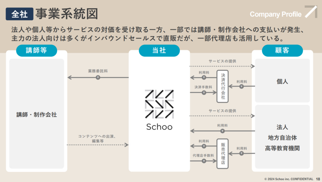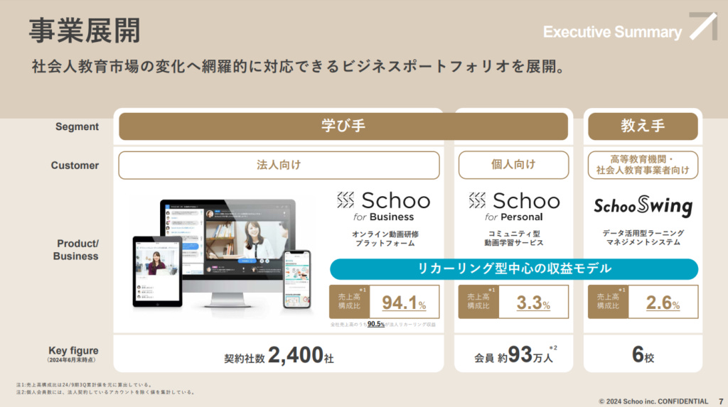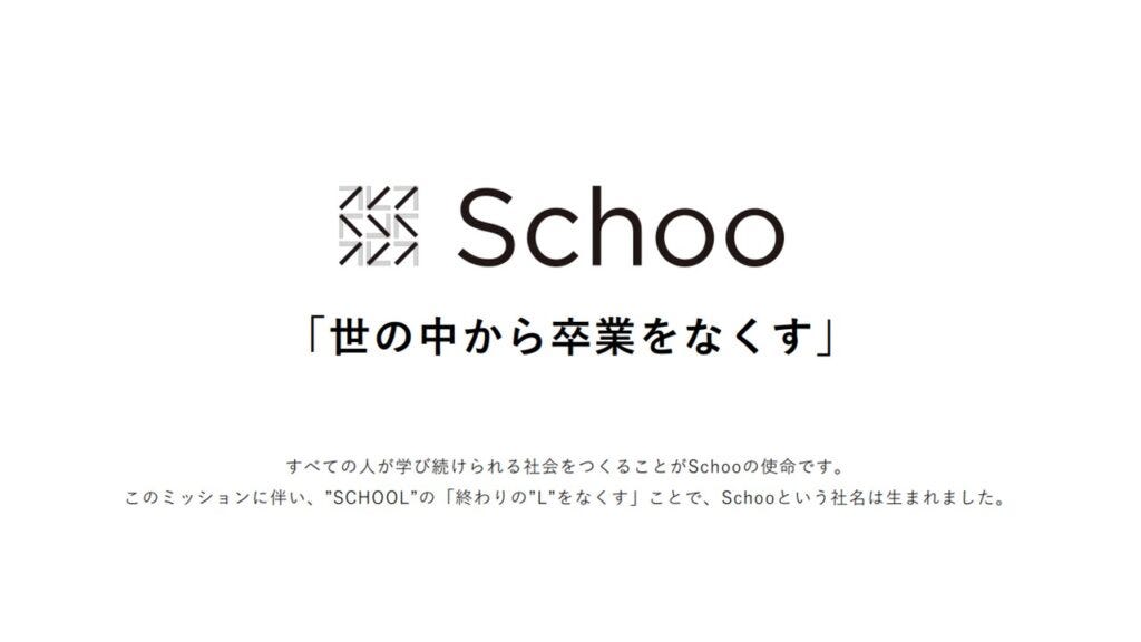 Schoo這個名字的由來,正反映了其公司理念——「讓畢業從這個世界上消失」。將英文「School」的最後一個字母「L」去掉,象徵學習本無終點,是一條不斷延續的旅程。Schoo的主要事業分為三大板塊:「Schoo For Business(法人)」、「Schoo For Personal(個人)」和「Schoo Swing」。其中,「Schoo For Business」作為主要收入來源,貢獻了總營業額的94.1%;而個人學習平台僅占3.3%,「Schoo Swing」則為教育機構的教師提供教學管理SaaS工具,佔總營業額的2.6%。