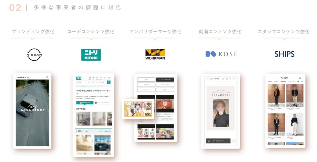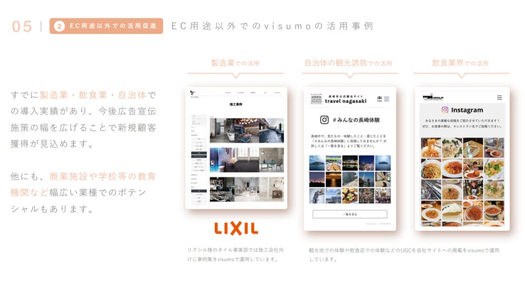雖然 Visumo 最初的主要應用場景是在 電子商務(EC)領域,幫助品牌透過 UGC(使用者生成內容)提升商品頁面的吸引力和轉換率,但隨著市場需求的變化,Visumo 的應用範圍也開始向 更多產業拓展。目前,Visumo 已經在 製造業、飲食業、自治體(地方政府) 等領域成功導入,並且未來也可能進一步應用於 商業設施、學校及教育機構 等更廣泛的產業。