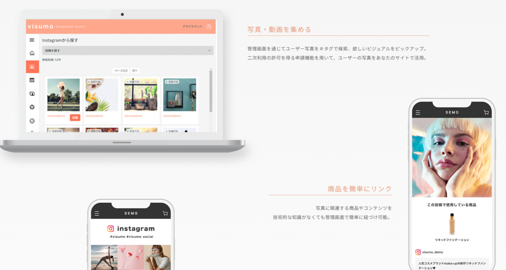 Visumo 提出的概念稱為 VDP(Visual Data Platform),這是一個視覺素材管理平台,能夠有效收納並整理品牌內部或用戶創作的靜態與動態內容,並將這些內容重新應用到品牌的 電商網站、行銷活動、社群媒體,讓品牌的內容生態更加完整,提升自有網站的互動性與購買體驗。對於服飾、美妝等高度視覺化的產業來說,Visumo 的服務能夠幫助品牌大幅提升內容運營效率,並透過消費者參與驅動更高的銷售轉換。