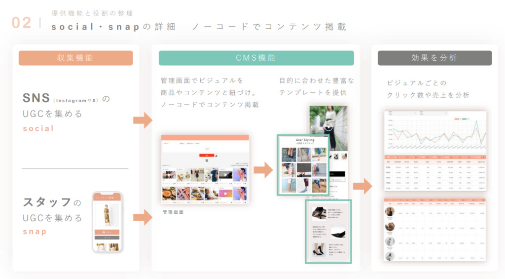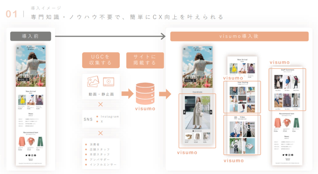 Visumo 的核心價值在於 幫助品牌更好地收集、管理與應用 UGC(使用者生成內容),同時降低技術門檻,讓行銷團隊能夠更直覺地運用這些素材。導入 Visumo 之前,品牌網站往往較為制式、內容單調,但導入後,品牌可以更靈活地展示 穿搭提案、使用者上傳的圖片與影音內容,讓網頁更豐富、吸引力更高,最終提升轉換率。