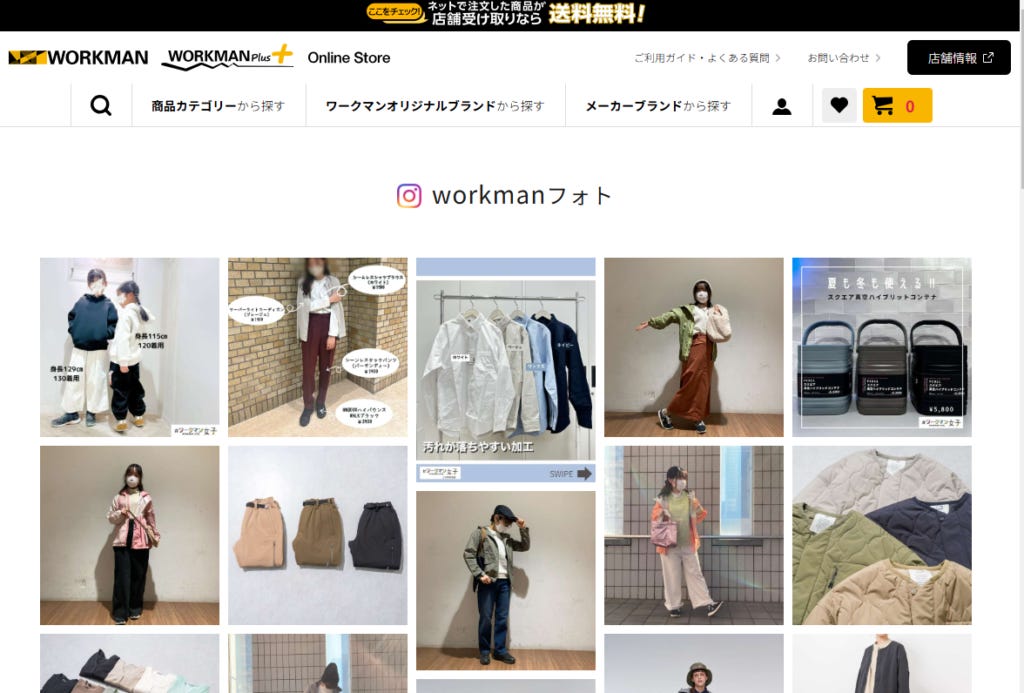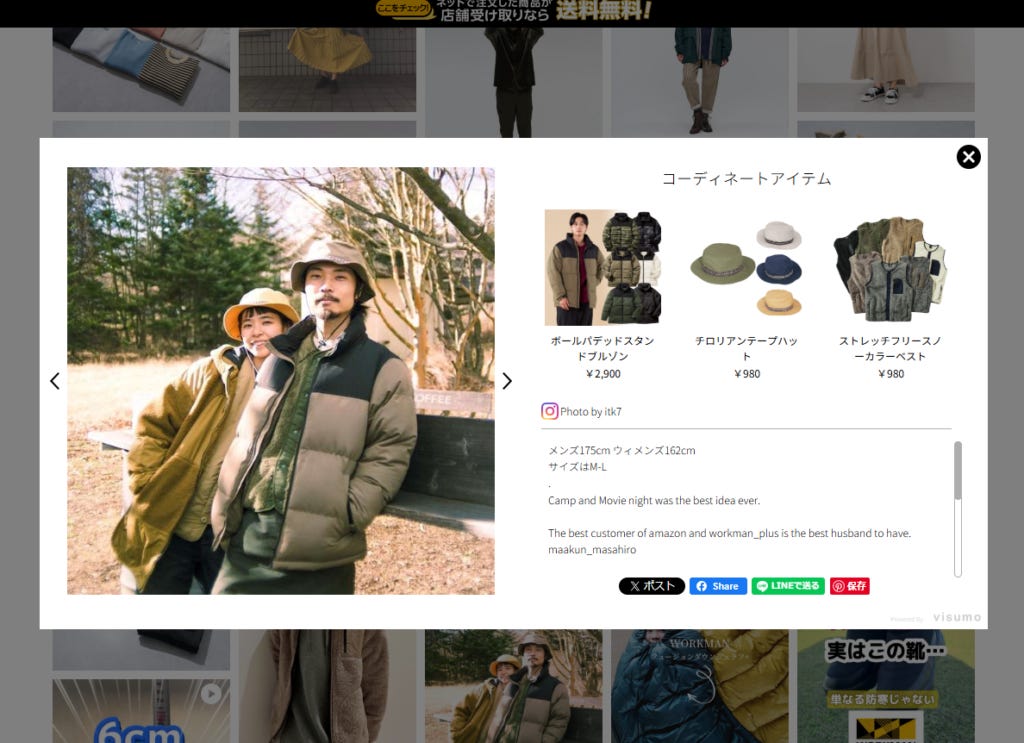 以 戶外機能服飾品牌 Workman 為例,其官方網站已導入 Visumo,成功地將 Instagram 上的使用者內容整合至品牌網站內,並以 「圖片牆」的方式呈現。這個圖片牆不僅能夠展示靜態圖片,也能夠播放動態影片,讓消費者在瀏覽品牌官網時,能夠直覺地看到其他使用者的穿搭分享與產品應用場景。
