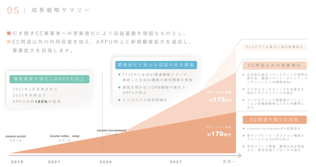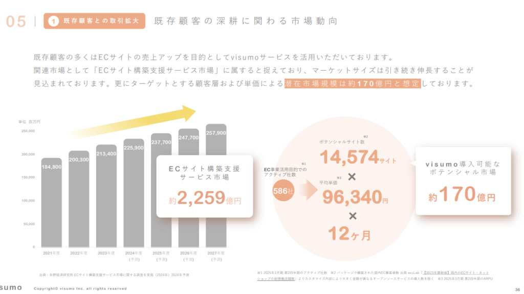 Visumo 在上市後,持續尋找成長機會,從目前的市場趨勢與潛在客戶規模來看,公司未來的發展仍有極大潛力。根據其市場分析,Visumo 將自身定位於 「EC 網站構築支援服務市場」,並認為這個市場仍在穩定成長,未來幾年內仍有相當大的擴展空間。 EC 網站構築支援服務市場 在近幾年保持增長,根據數據預測,該市場的規模將從 2021 年的 1,848 億日圓,成長至 2027 年的 2,579 億日圓。這代表著在電子商務需求不斷上升的情況下,品牌對於 內容管理、數據分析、UGC 應用等 MarTech 工具的需求 也將持續擴大。
