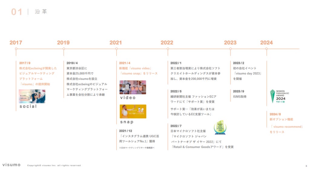 Visumo 的技術最早源於 日本最大的開店平台之一 ECbeing,最初是 ECbeing 內部的一個 Upsell 模組,於 2017 年推出。然而,到了 2019 年,Visumo 被拆分成獨立公司,這樣的策略使其能夠跳脫 ECbeing 的生態圈,與其他開店平台更靈活地合作。如果 Visumo 繼續作為 ECbeing 內部的產品,可能只能服務使用 ECbeing 平台的客戶,無法擴展至其他電商平台。然而,成為獨立公司後,Visumo 可以與不同的電商解決方案串接,擴大市場機會。