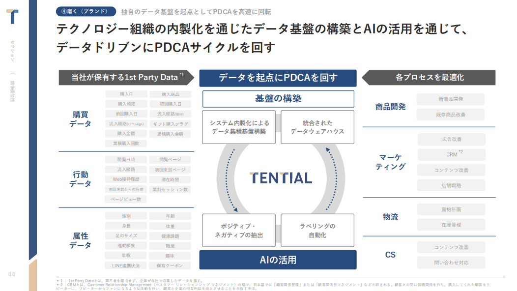 而支撐這種速度的核心,是他們自建的資料驅動型 PDCA 系統。TENTIAL 將自家電商、門市、LINE 會員與客服 VOC(Voice of Customer)整合成龐大的「1st Party Data」,涵蓋購買、行為與屬性三大類資料,透過內部開發的 AI 進行自動分類與情緒分析。當顧客留言「衣服穿久會鬆」、「內層容易勾線」時,AI 會即時歸類並量化為改善指標,進而回饋到研發流程。