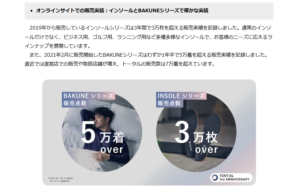 TENTIAL 的第一個產品,是2019年推出的功能性鞋墊「TENTIAL ZERO」。靈感來自 LINE 上的「足の相談所」服務——他們邀請民眾填寫足部困擾問卷,用數據分析設計出第一款產品。隨後,品牌不斷擴張產品線: