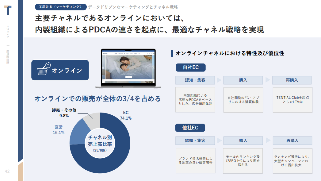 TENTIAL 的核心銷售通路是 EC(電子商務),佔總營收的 74%,其中自營網站與應用程式形成品牌的主戰場。它並非單純的 D2C 模式,而是以 數據為起點的高速 PDCA 體系:從廣告投放、訪問行為到再購率,皆由內部數據團隊統合分析,實現即時修正。