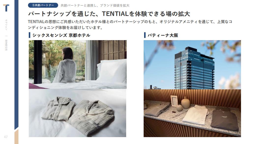 另一方面,TENTIAL 也在積極擴張線下體驗通路,特別是與高級飯店品牌合作,讓消費者能在現實場域中「體驗產品的好睡」。目前,品牌已與京都的 Six Senses Hotel、大阪的 Patina Hotel 等高端飯店合作,推出專屬的 BAKUNE 睡衣與寢具套組,作為客房備品與限定銷售。