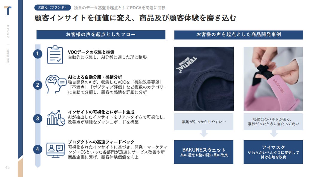 所有洞察都以 Dashboard 視覺化呈現,讓研發、行銷、客服能在同一週期內完成修正。像是顧客反映「BAKUNE Sweat 的內層容易勾線」後,他們迅速更換纖維結構;另一款「BAKUNE Eye Mask」也依回饋改為柔軟彈性布料。TENTIAL 讓每一條評論都進入 AI 驅動的改善循環,使「顧客聲音」不再只是客服紀錄,而是產品迭代的燃料,也成為品牌在日本 D2C 領域維持高速創新的關鍵。