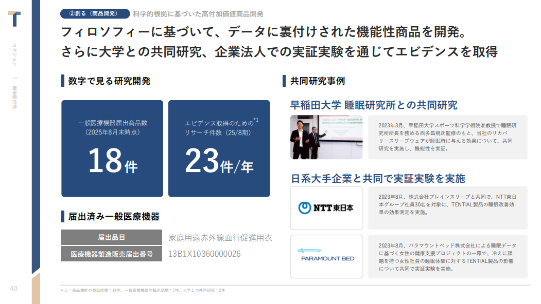 TENTIAL 並非靠感性訴求來推廣「好睡」的概念,而是用醫學與數據證據(Evidence)建立品牌可信度。創立初期,團隊便與早稻田大學睡眠研究所共同展開實驗,檢驗其遠紅外線纖維材質對於血流促進與疲勞回復的實際效果。