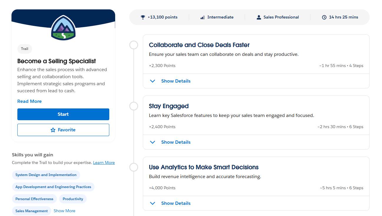 不過,我認為 Trailhead 的真正價值並不在於「教你怎麼點按鈕」,而在於「教你如何做業務」。它不僅是一個系統的學習平台,更是一套業務科學化的方法論。舉例來說,Sales Cloud 的模組就像一本「海外業務教科書」,裡面所整理的正是 Salesforce 在全球市場上,透過無數企業案例所累積出來的最佳實踐。