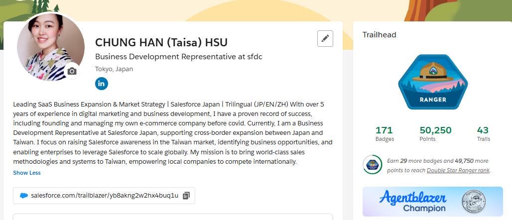 對我來說,Trailhead 不只是一個平台,而是一座「數位轉型的山脈」,一步步引導我們走向更科學、更有效率的業務未來。